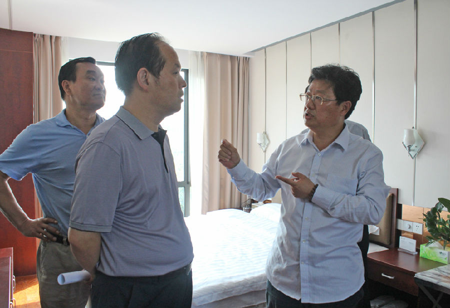 在天丰创新产品模块化酒店、集成房屋样板间参观时,其功能模块工厂化预制完成,采用保温隔热的围护材料,快速集成,安装与装修可一次到位、即装即住,循环使用、绿色环保,领导对这种模块化建筑十分感兴趣。