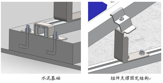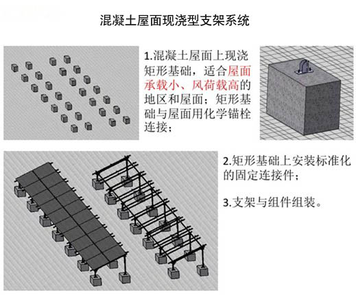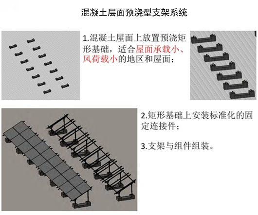 砼屋顶安装系统适合户外或荷载量较大的平面屋顶,底部框架使用优质铝导轨,预埋螺栓固定,支撑件材料为不锈钢,牢固美观,独创的铝合金导轨与单元连接设计,无需现场二次加工。