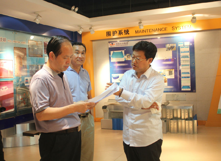 在天丰集团展厅,李总提到天丰紧抓国家大力倡导的建筑产业化、工业化发展机遇及新型城镇化建设契机,不断地进行钢结构技术和产品创新,为全面推广钢结构建筑体系提供了坚实保障。